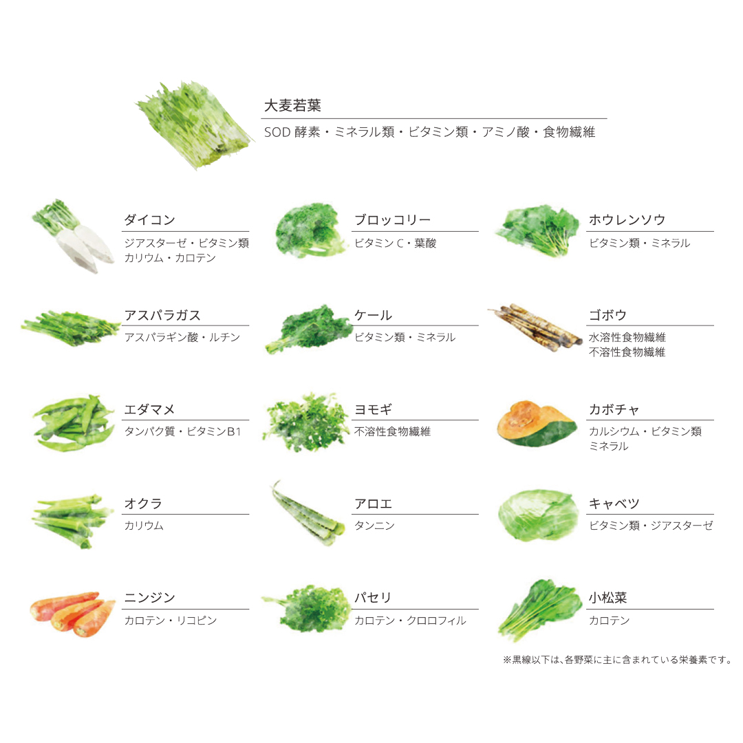 大麦若葉末(国内製造)、難消化性デキストリン(水溶性食物繊維)、還元麦芽糖、澱粉、有胞子性乳酸菌末、キダチアロエ末、キャベツ末、ゴボウ末、ダイコン末、ニンジン末、穀物発酵抽出物(小麦を含む)、野菜混合末(ケール末、ブロッコリー末、ヨモギ末、アスパラガス末、オクラ末、コマツナ末、カボチャ末、ダイコン葉末、パセリ末、ホウレンソウ末)、ビフィズス菌末(乳成分を含む)、エダマメ末(大豆を含む)、殺菌乳酸菌末、白桃花抽出物(ももを含む)