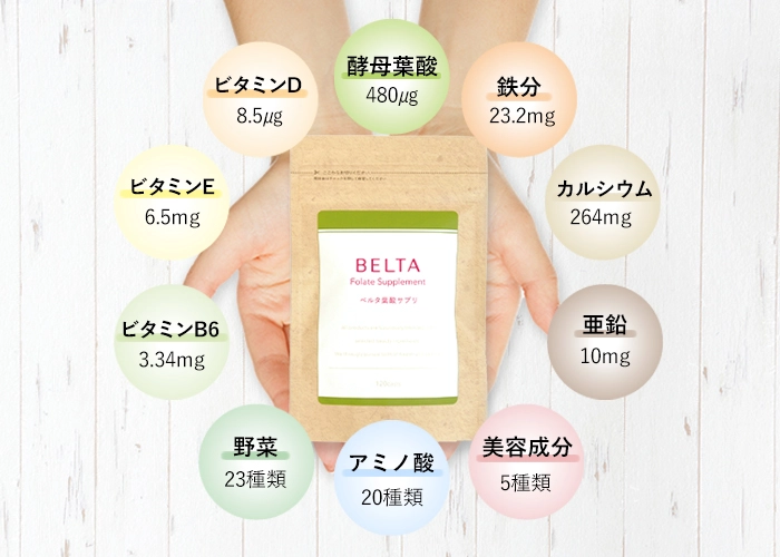 ベルタ葉酸サプリはママ自身と赤ちゃんの健康に必要な葉酸480㎍、ビタミン・ミネラル27種類、アミノ酸20種類、野菜23種類など合計75種類の栄養素を配合したマルチビタミン葉酸サプリです。