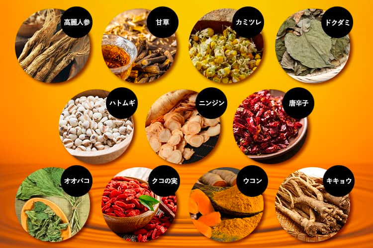亜麻仁油(国内製造)、田七人参エキス末、キバナオウギ茎エキス末、デキストリン、マカエキス末(マカエキス末、酸素分解マカ粉末)、コエンザイムQ10(還元型)、ビタミンE含有植物油、大豆抽出物、DHA・EPA含有生成魚油、セレン含有酵母、αリポ酸、ザクロエキス末、米胚芽エキス末、植物発酵エキス末、イナゴマメ抽出物、醗酵黒ニンニク末、イソマルトオリゴ糖、スピルリナ原末、L-カルニチンフマル酸塩、ローヤルゼリー末、乾燥ビール酵母、海藻カルシウム、キヌア発芽粉末、野菜粉末(大麦若葉、ケール、ブロッコリー、南瓜、桑の葉、セロリ、パセリ、ほうれん草、人参、トマト、ゴーヤ、チンゲン菜、モロヘイヤ、よもぎ)、たんぽぽ粉末、高麗人参エキス末、生姜エキス/ゼラチン、グリセリン、グルコン酸亜鉛、ピロリン酸第二鉄、グリイセリン脂肪酸エステル、ミツロウ、V.C、カラメル色素、ナイアシン、卵殻カルシウム、V.B6、V.B2、V.B1、葉酸、V.A、ラクトフェリン(乳由来)、塩化カリウム、V.B12、V.D(原材料の一部に、卵、大豆、リンゴ、キウイフルーツ、バナナ、モモ、ゼラチンを含む)