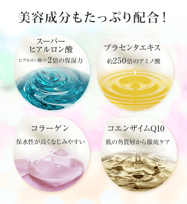 水、BG、スクワラン、ミリスチルアルコール、ポリソルベート60、カニナバラ果実エキス、セイヨウサンザシ果実エキス、セイヨウノコギリソウエキス、タチジャコウソウ花/葉エキス、ローズマリー葉エキス、プラセンタエキス、アスパラギン酸、アルギニン、グリシン、アスパラギン酸メチルシラノールヒドロキシプロリン、セラミド2、アスコルビルグルコシド、グルコシルヘスペリジン、トコフェロール、ユビキノン、葉酸、加水分解コラーゲン、アセチルヒアルロン酸Na、アラントイン、グリチルリチン酸2K、加水分解水添デンプン、グリコシルトレハロース、コメヌカ油、ペンチレングリコール、(アクリル酸ヒドロキシエチル/アクリロイルジメチルタウリンNa)コポリマー、ステアリン酸ソルビタン、フェノキシエタノール、グレープフルーツ果皮油、エタノール、フィトステロールズ
