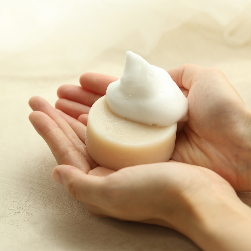 自社蒸留した月桃のハーブウォーターと良質な植物オイルから生まれた石けんのもとを自社工場で調合し、しっとりとした泡立ちが特徴です。