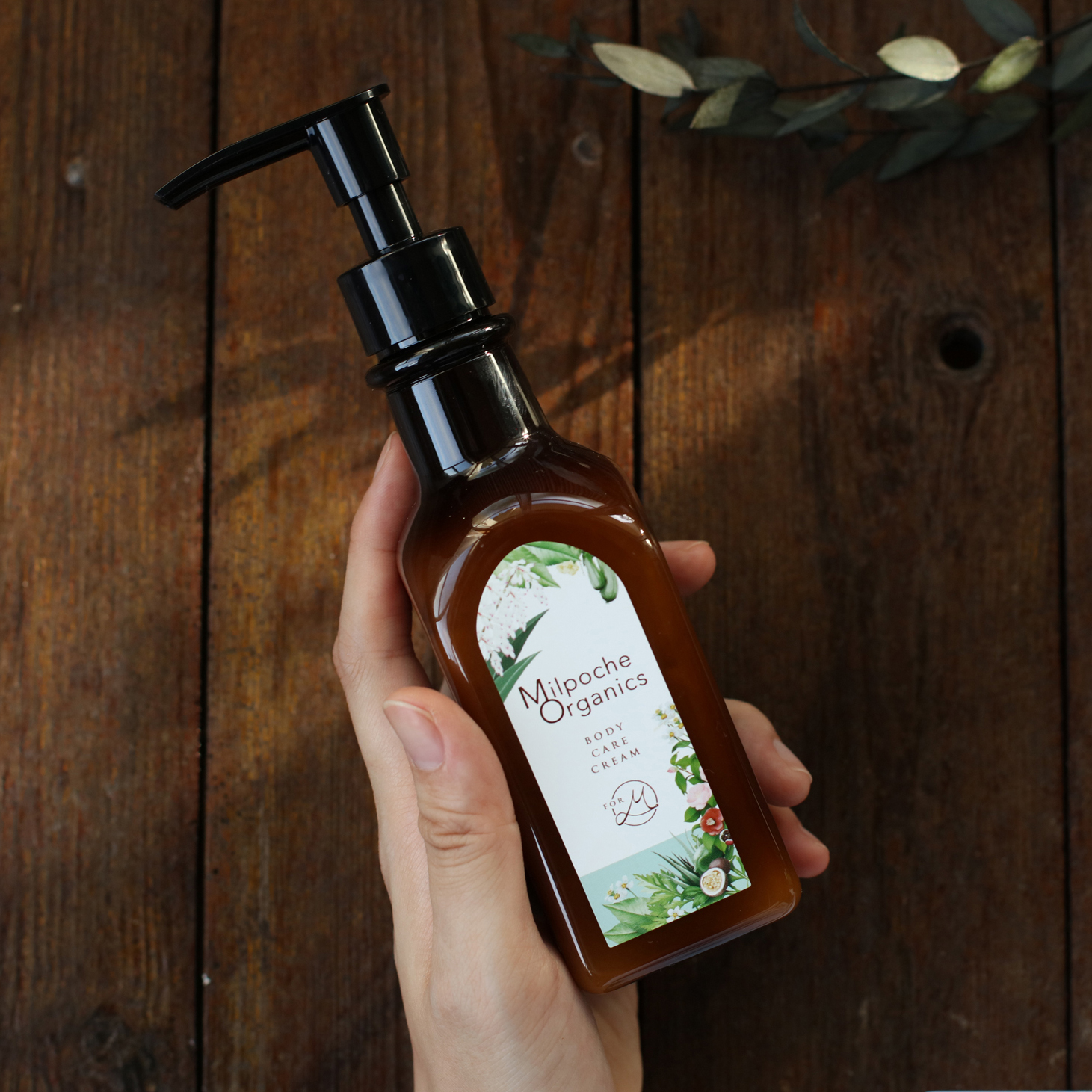 ボディケアクリームを適量手のひらにとり、やさしくなじませてください。